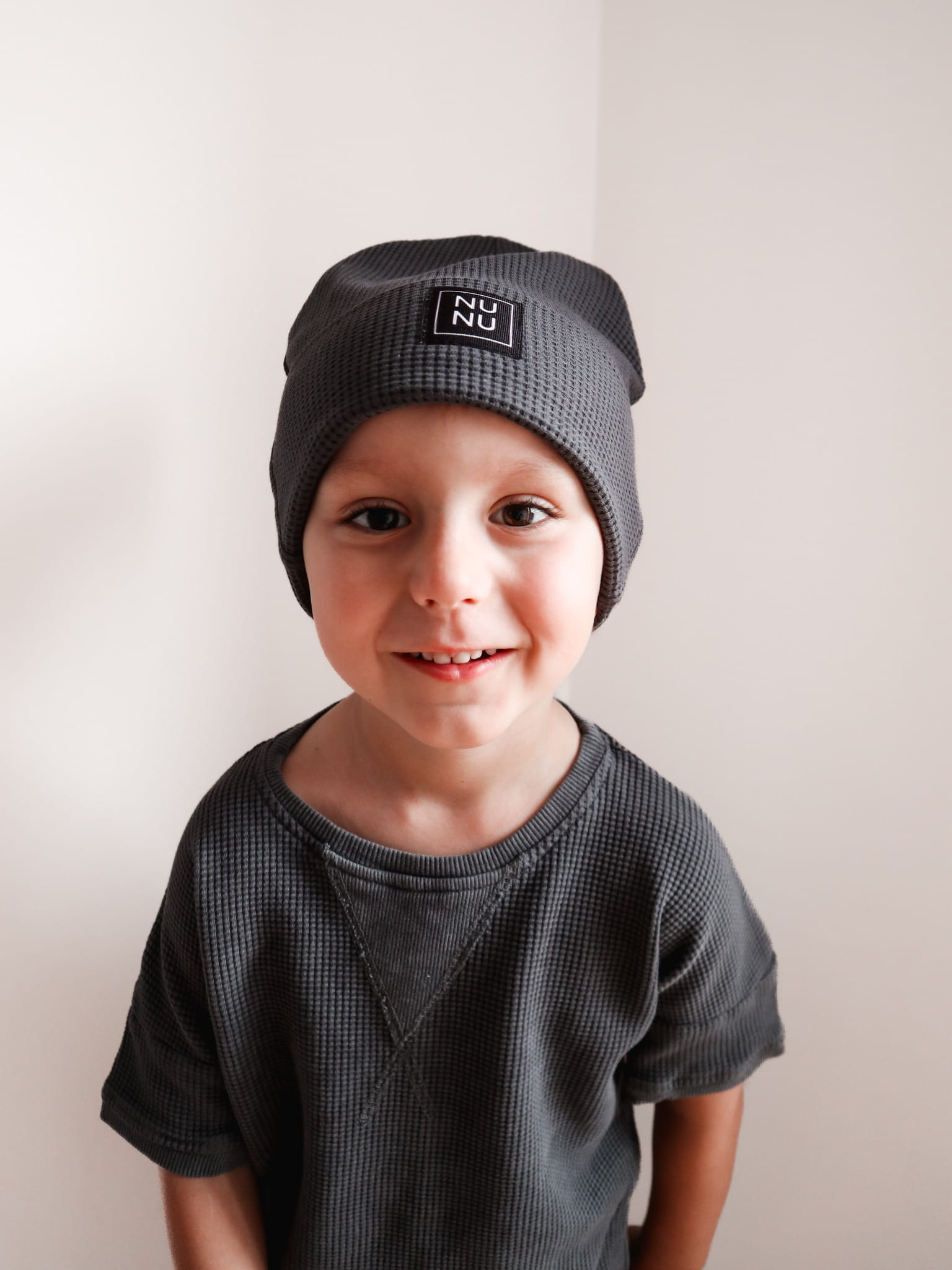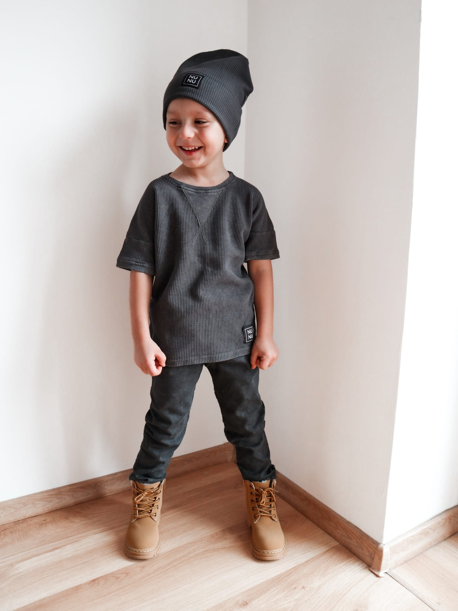 Grafitowy t-shirt o wafelkowej strukturze to ubranie charakteryzujące się delikatnym, reliefowym wzorem przypominającym plastry wafli.