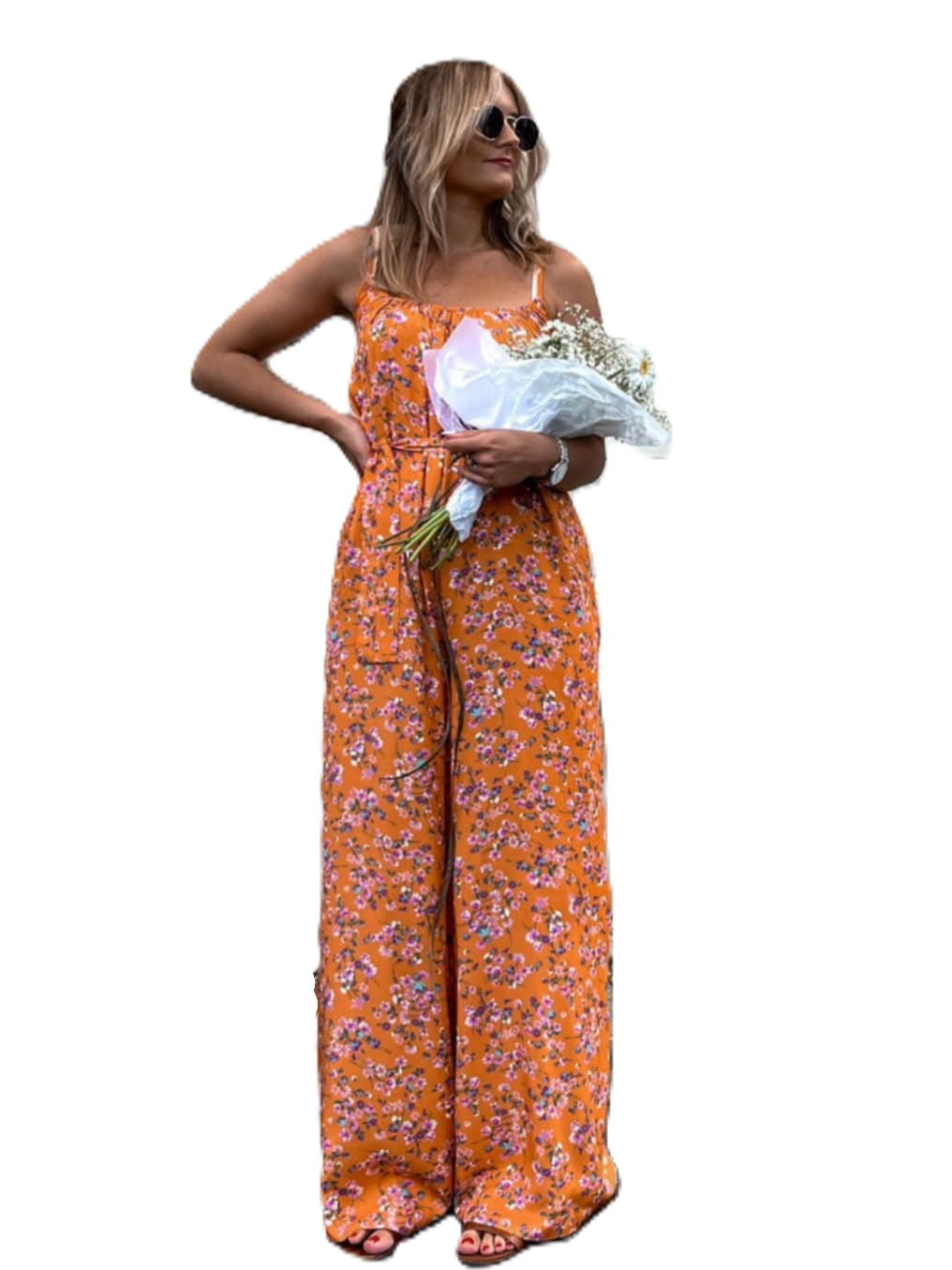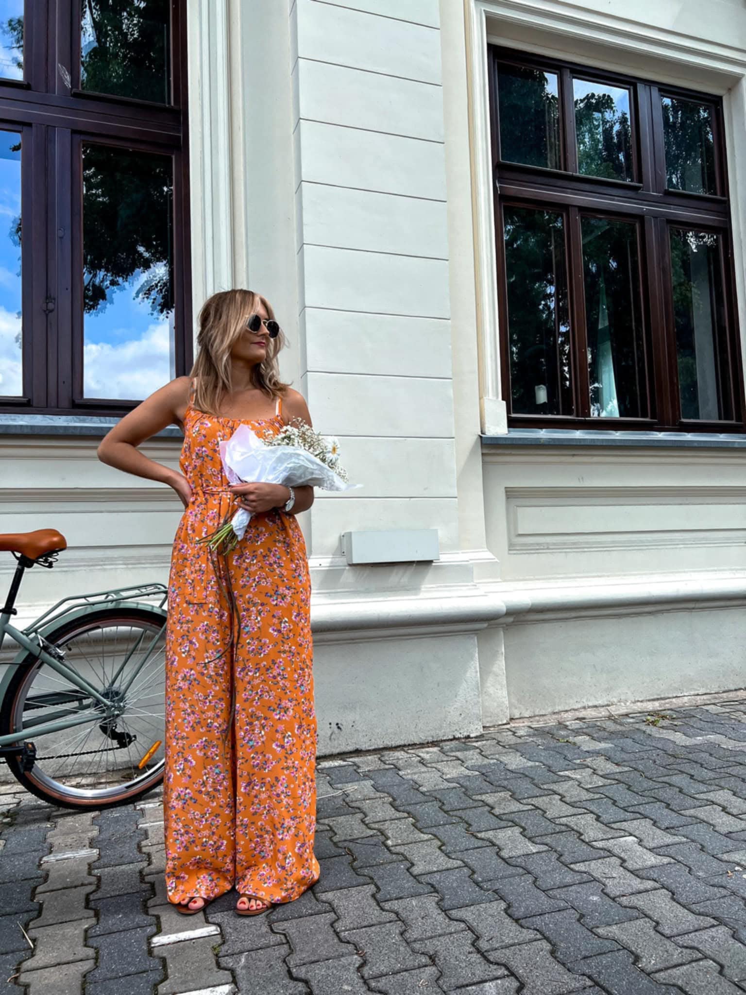 Pomarańczowy kombinezon w delikatne kwiatki to idealna propozycja na lato.
