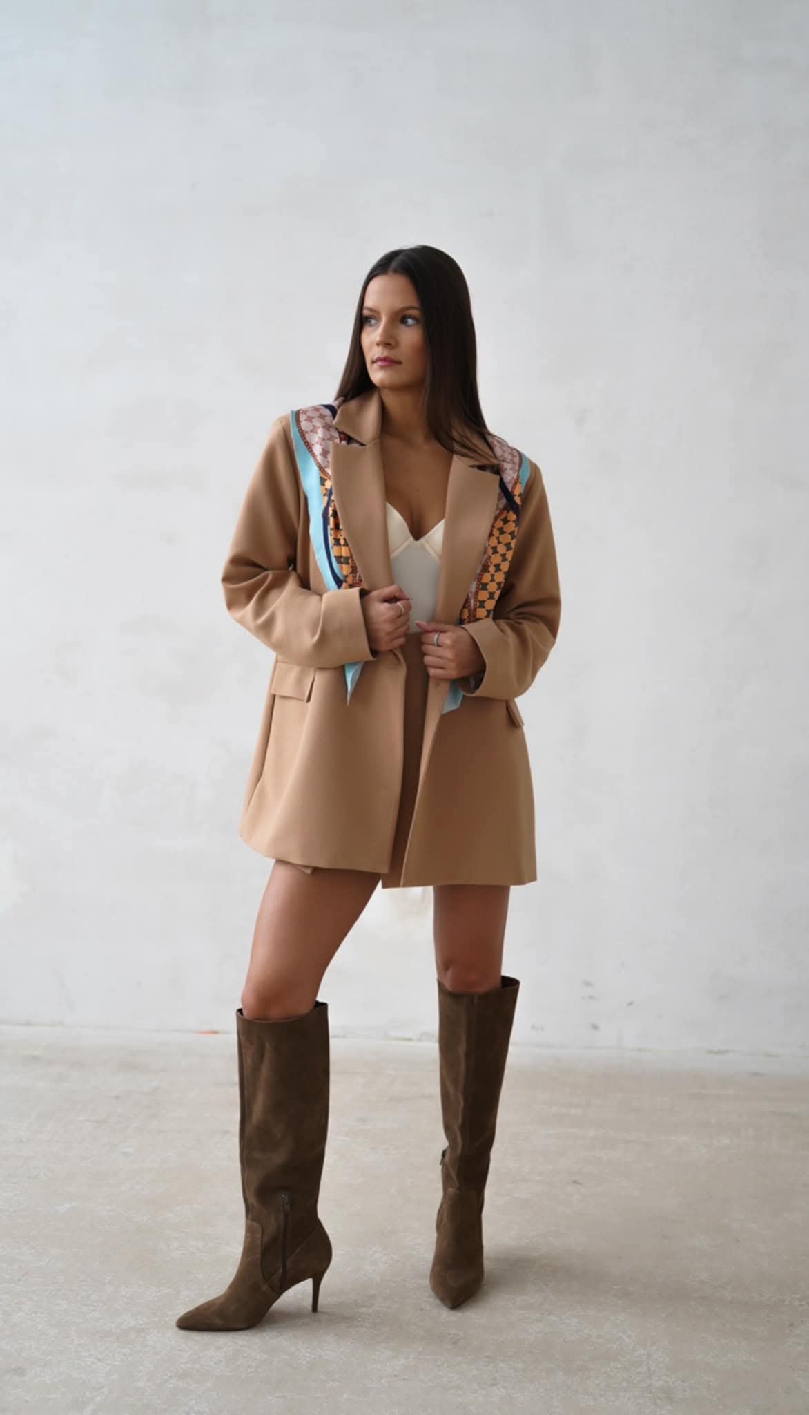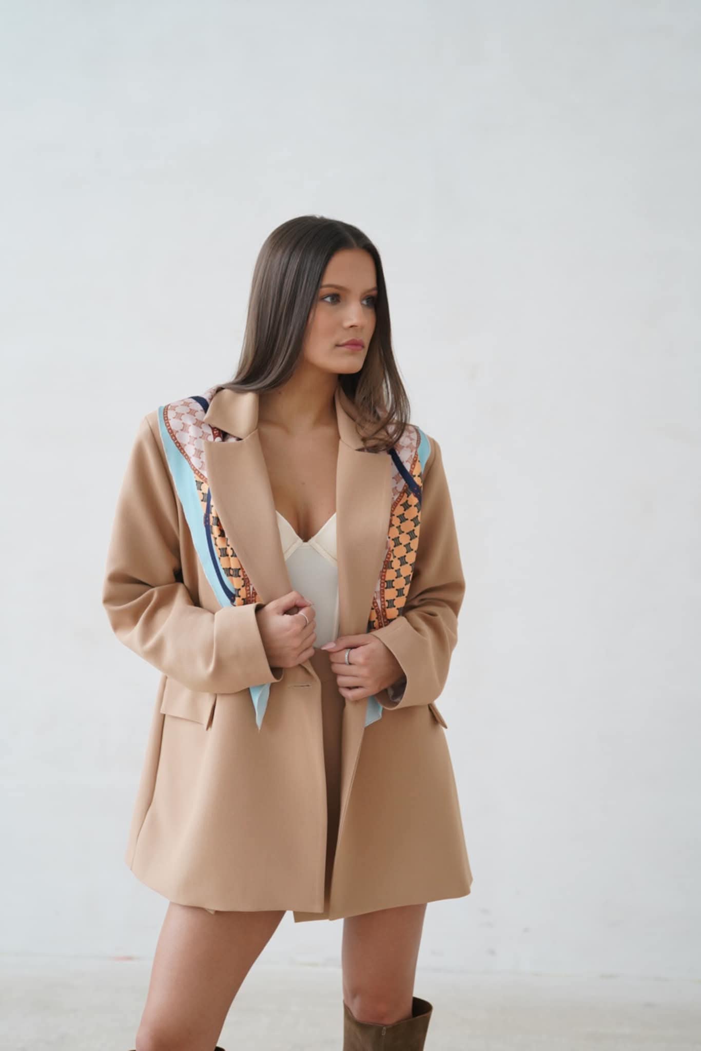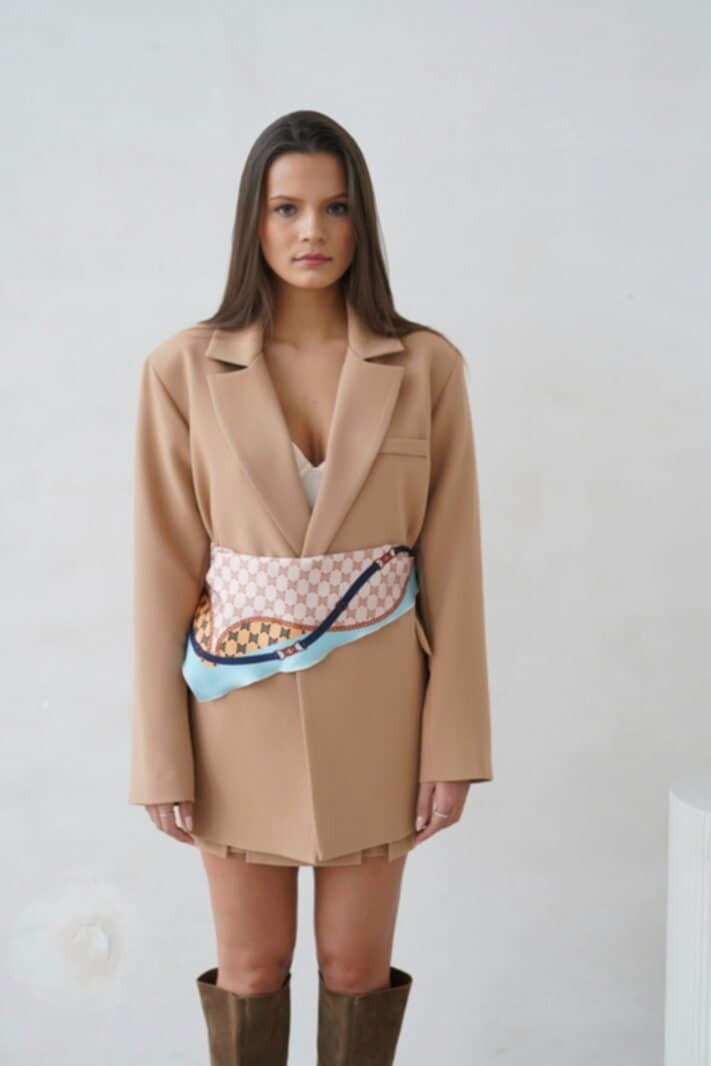 Camelowa marynarka damska z apaszką – Purpura elegancja na wiele okazji .