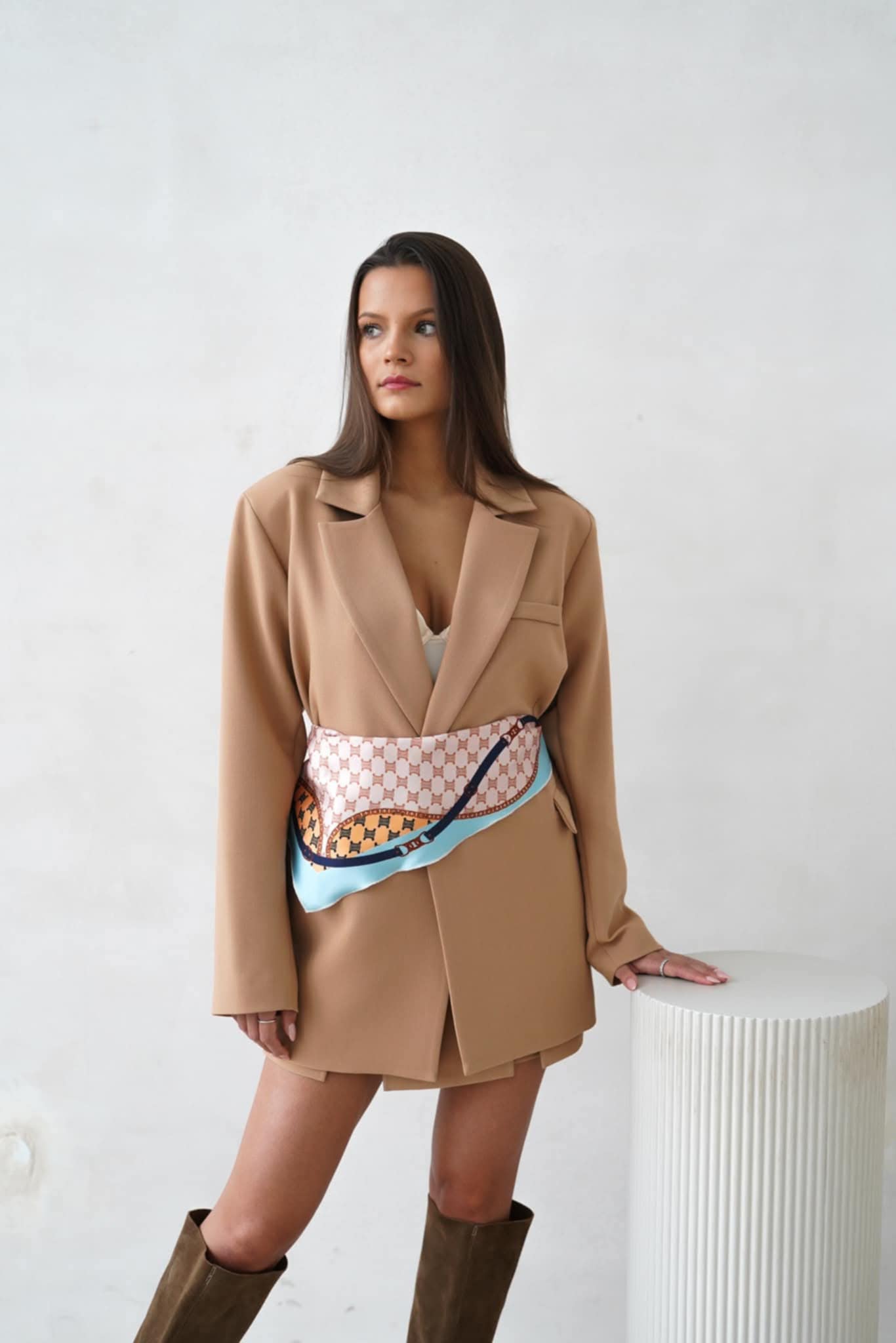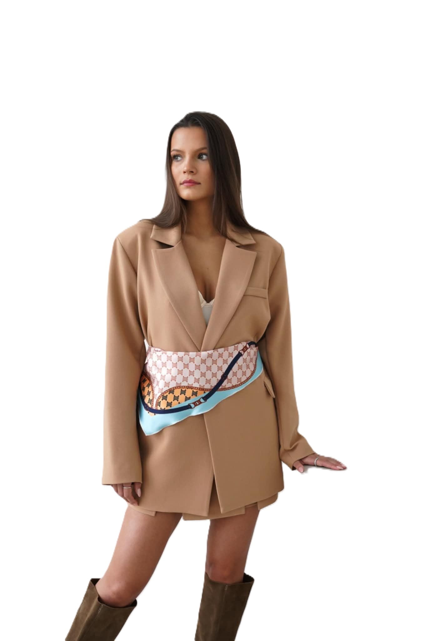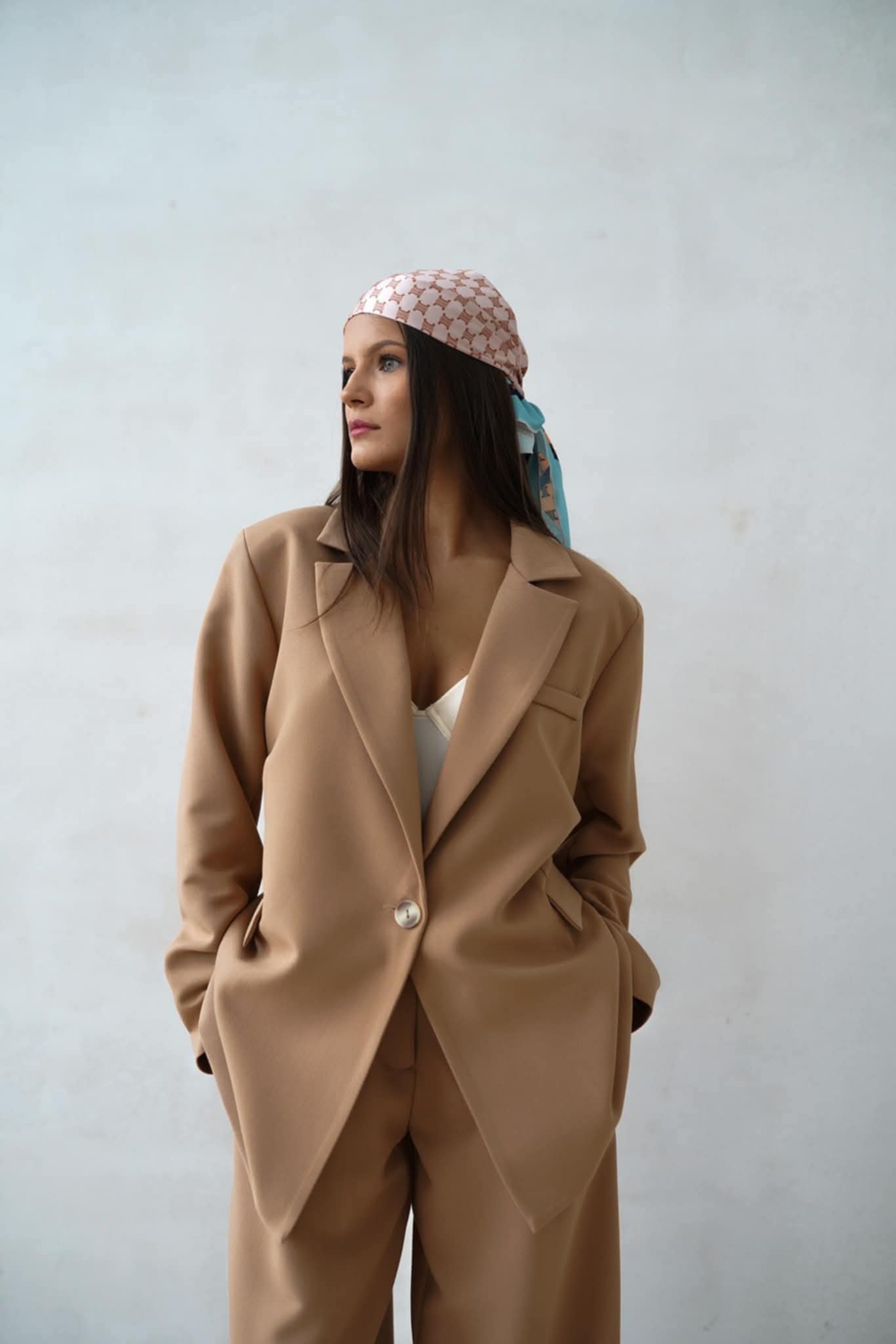 Camelowa marynarka damska z apaszką – Purpura elegancja na wiele okazji .