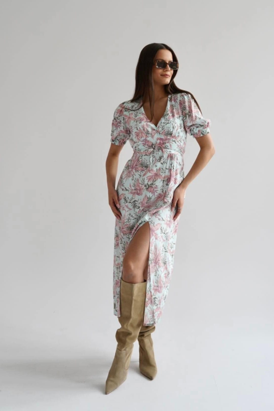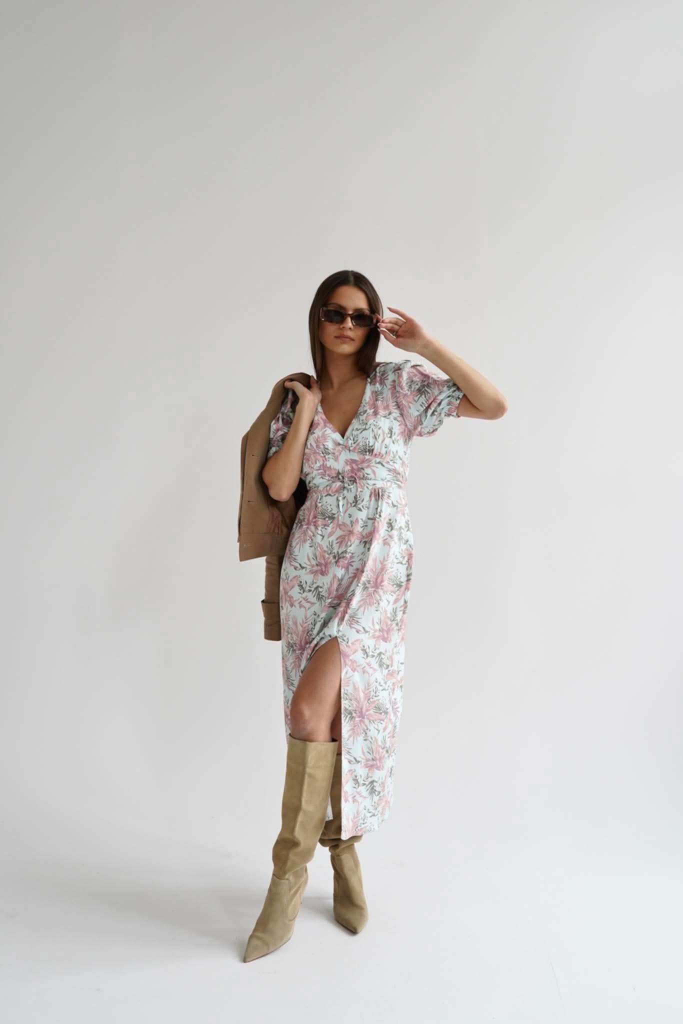 Sukienka kopertowa midi z wiskozy – pastelowy wzór liści w odcieniach różu i szałwii ,