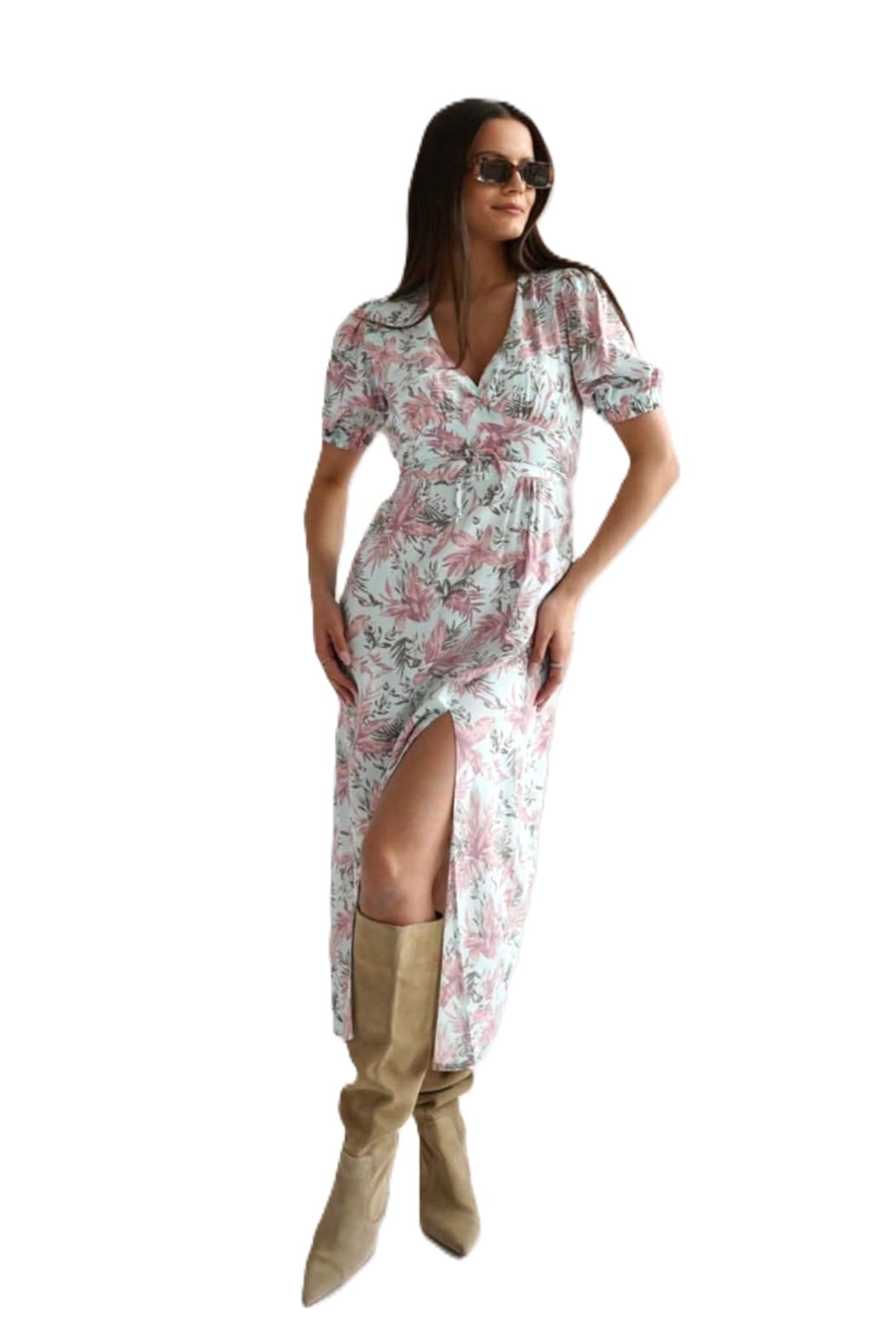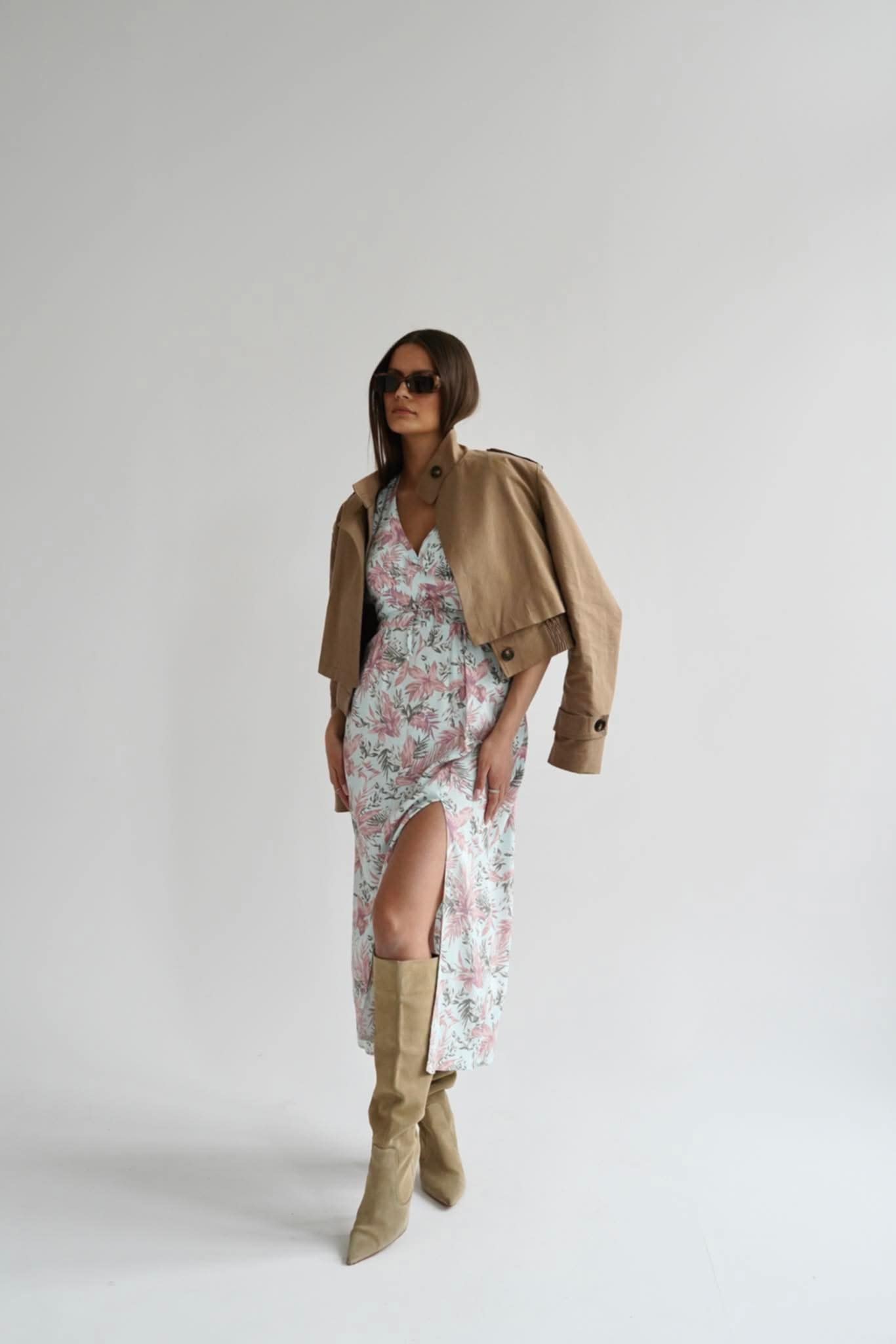 Model Mira zachwyca kobiecym krojem, pastelowym wzorem w liście oraz lekkim rozcięciem z przodu.