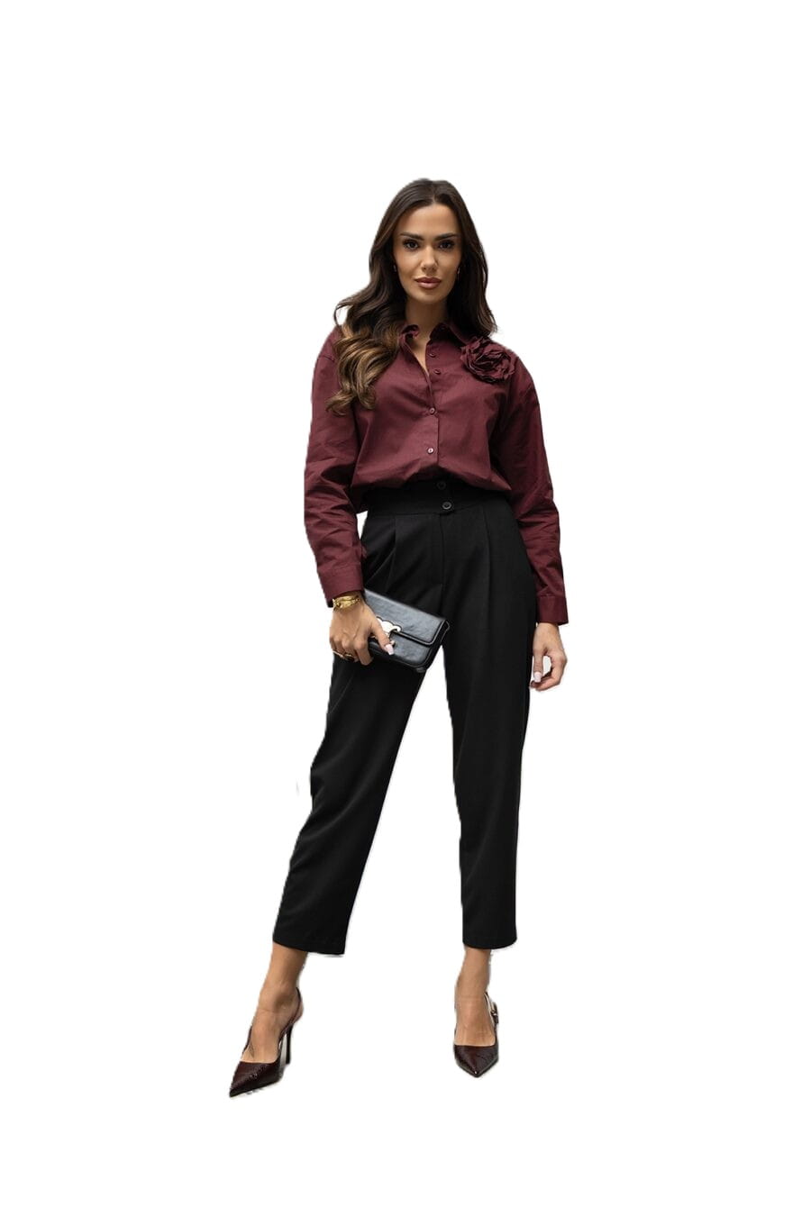 Spodnie posiadają asymetryczne, ozdobne zapięcie w pasie, które dodaje nowoczesnego i eleganckiego charakteru. To subtelny, ale wyrazisty element, który wyróżnia model na tle klasycznych czarnych spodni materiałowych.