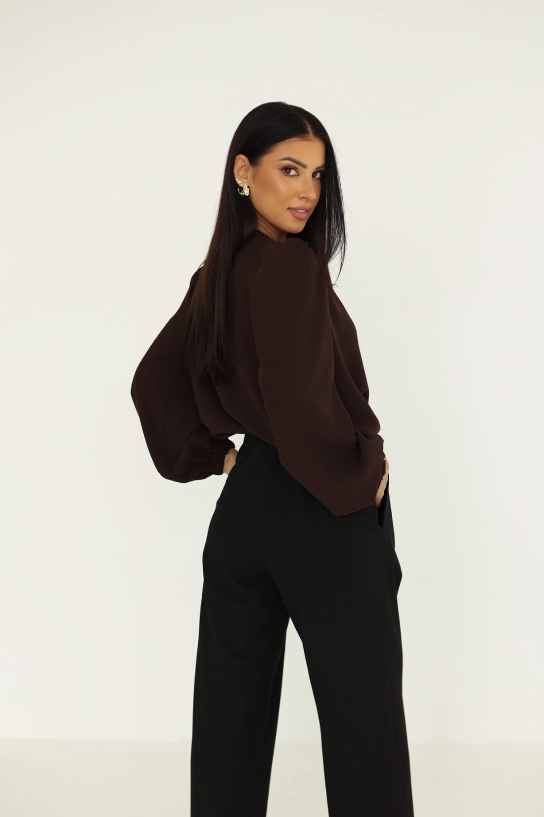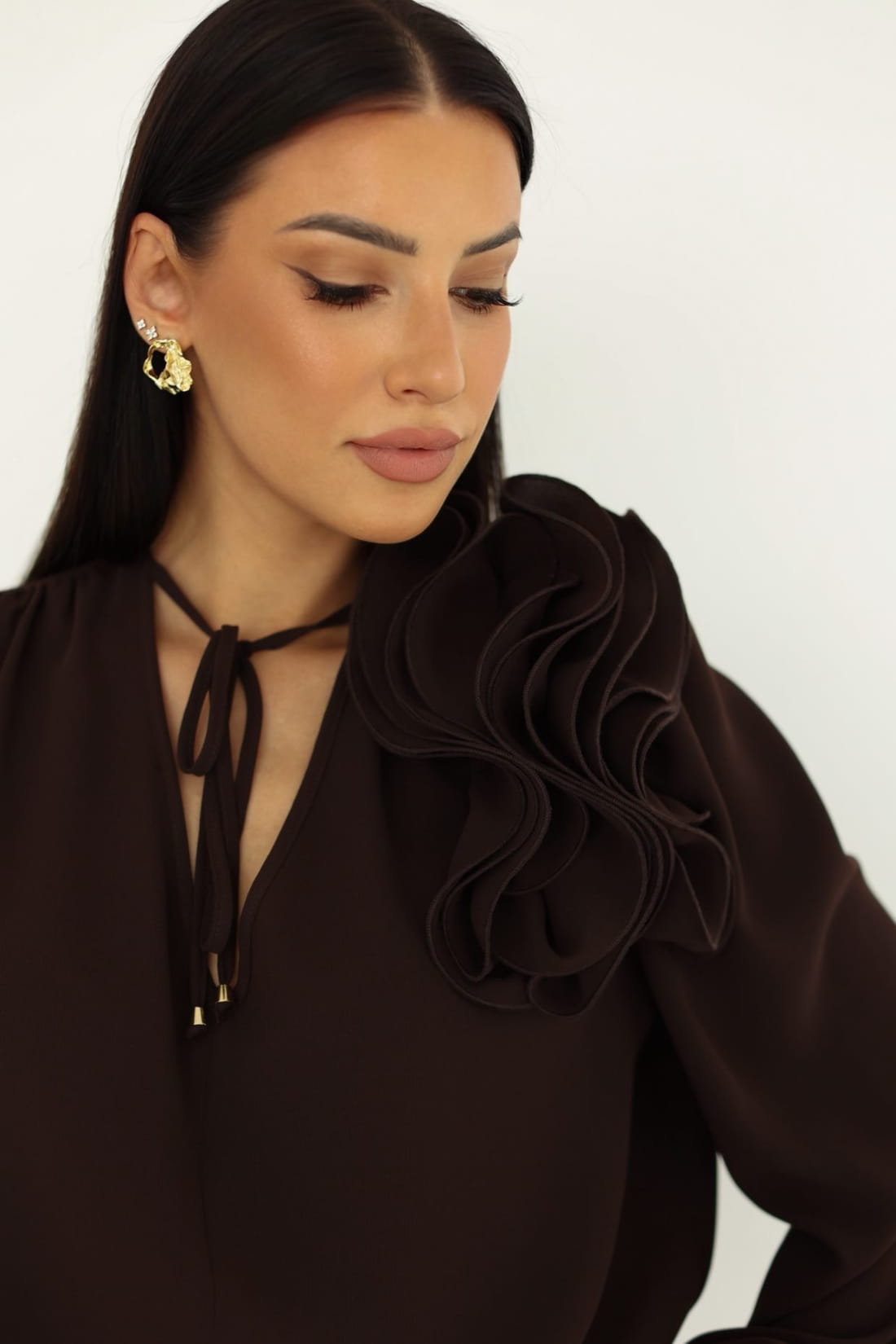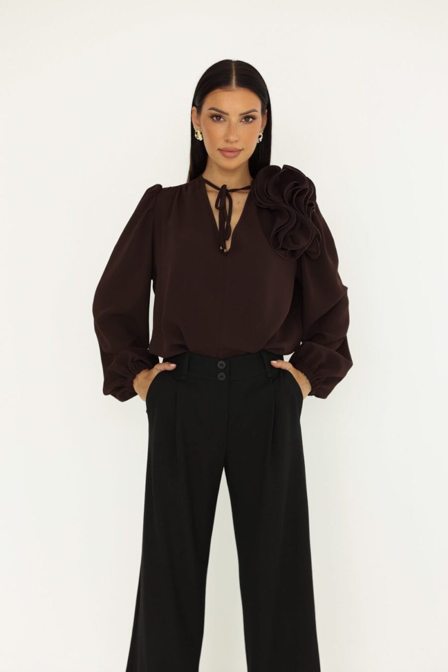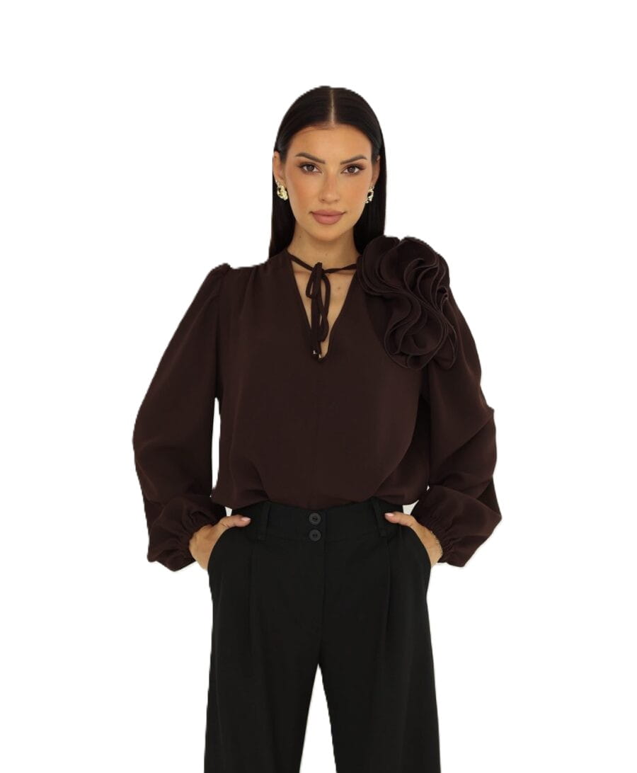 Stylowa bluzka damska Rose czekoladowa kwiat na ramieniu dekolt V
