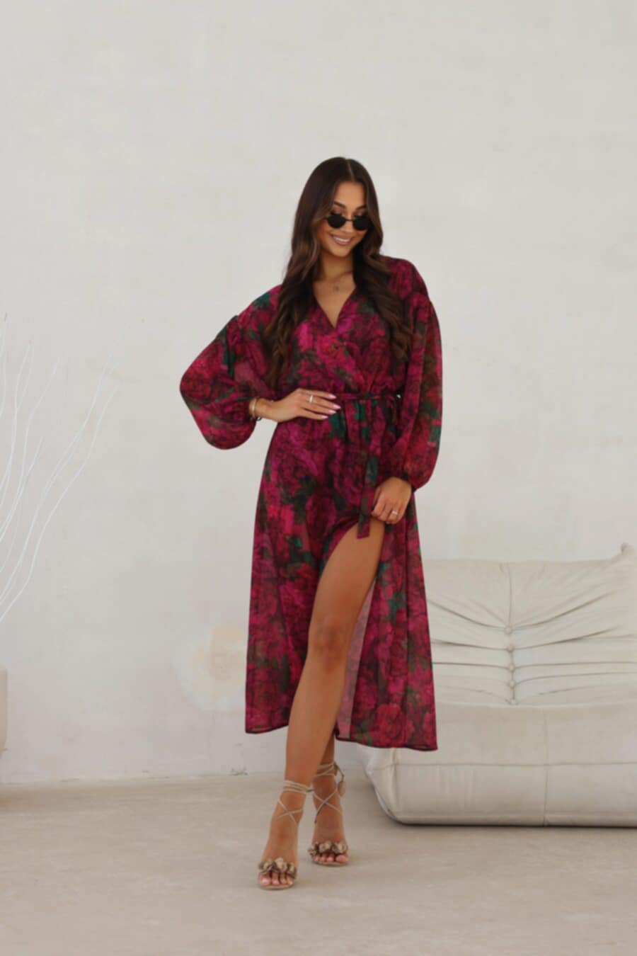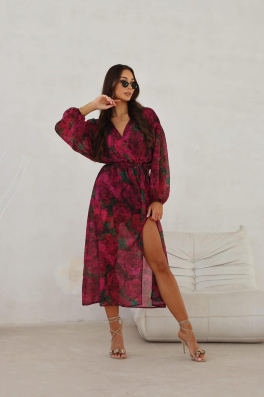 Rozcięcie delikatnie eksponuje nogę, nadając sukience zmysłowego charakteru.