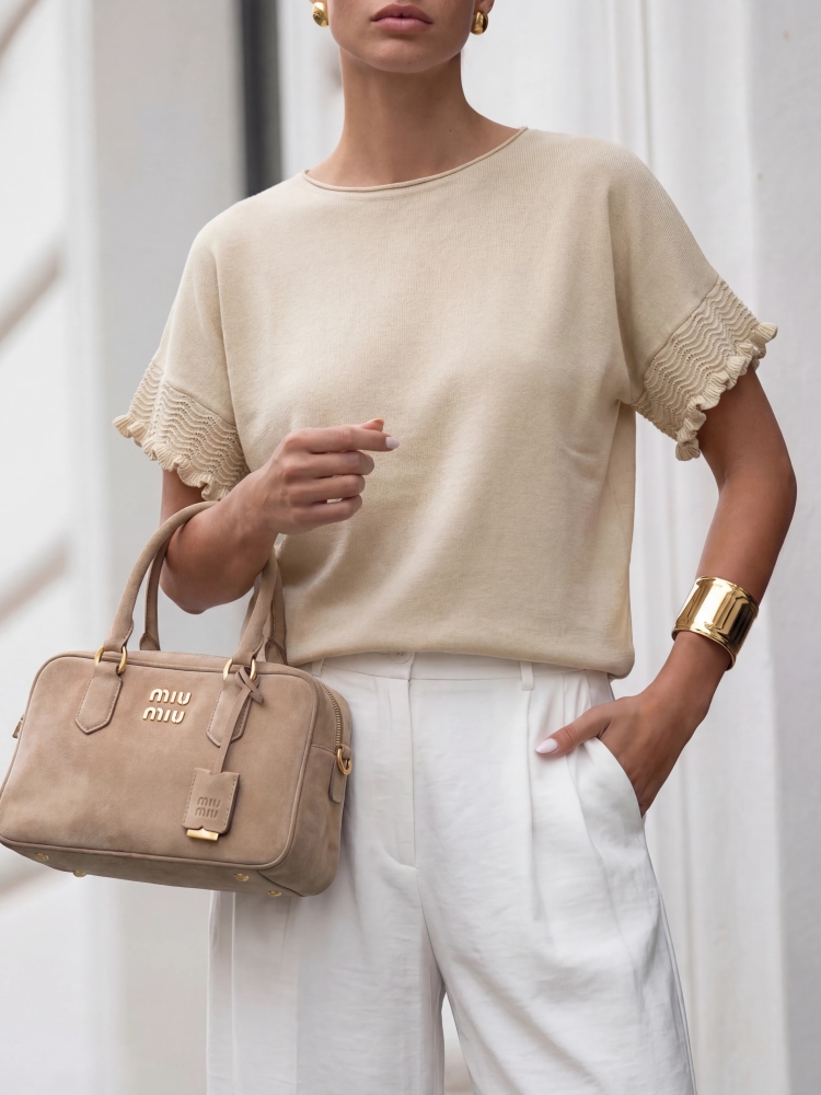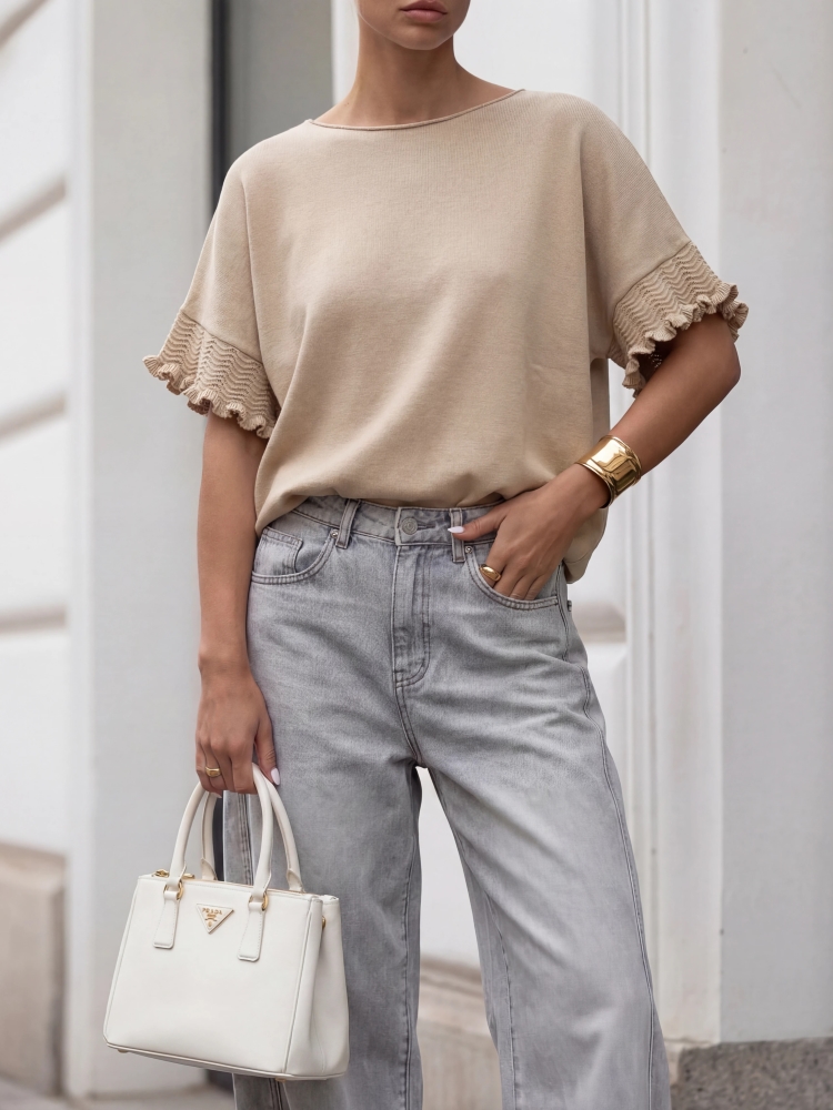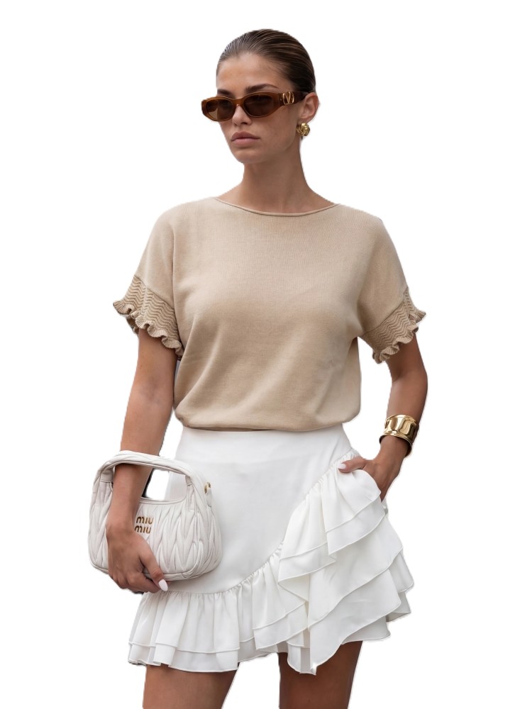 Sweter damski beżowy krótki rękaw z falbanką wiskoza