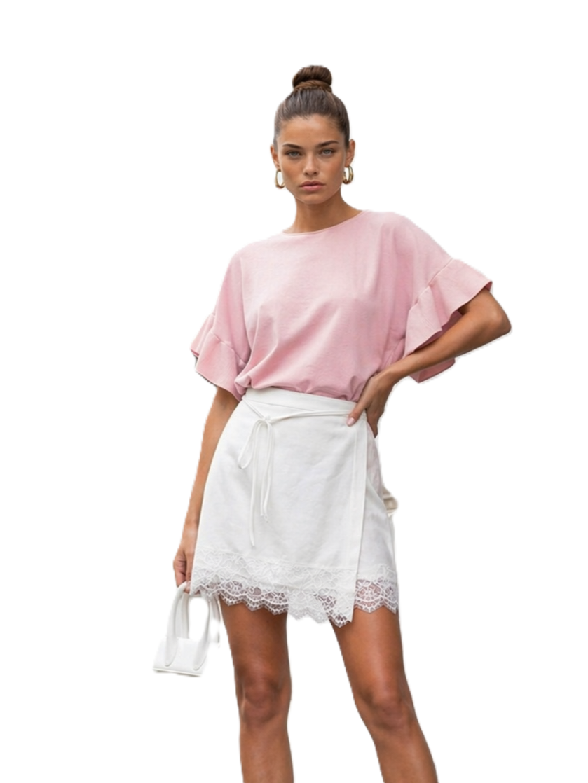 Sweterek damski pudrowy róż z falbaną wiskoza krótki rękaw