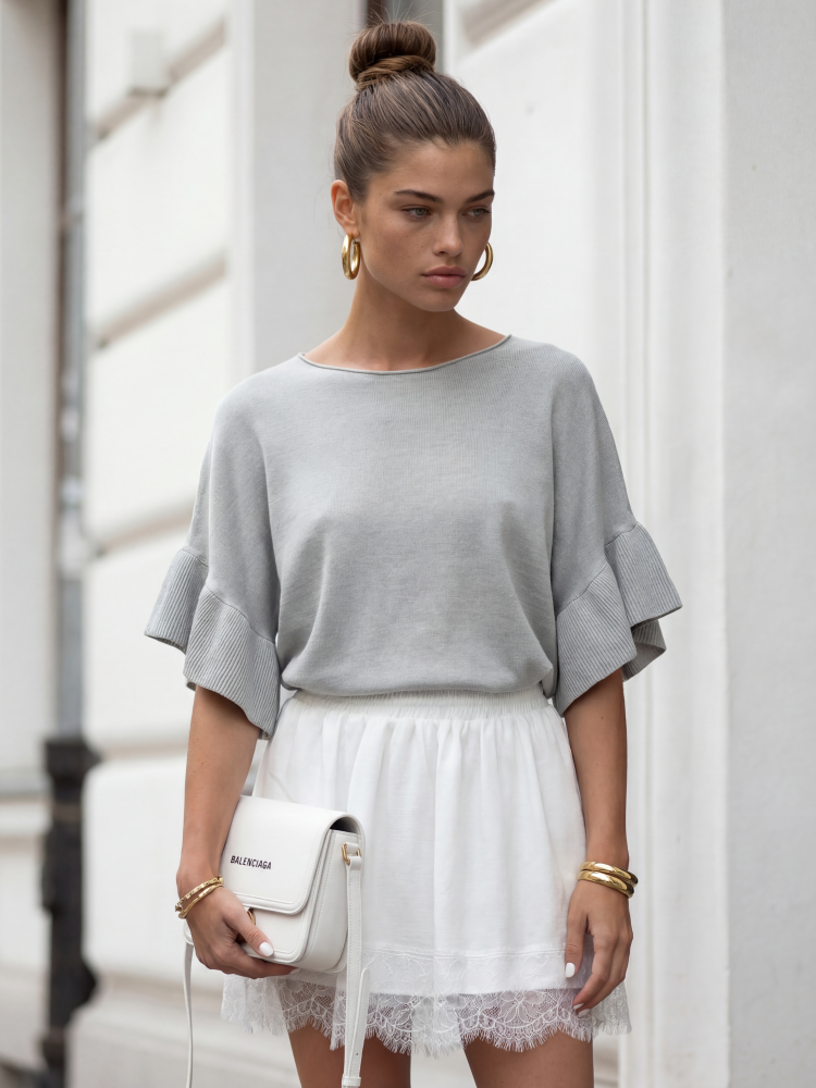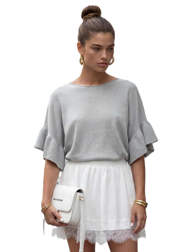 Sweterek damski szary z falbaną wiskoza krótki rękaw